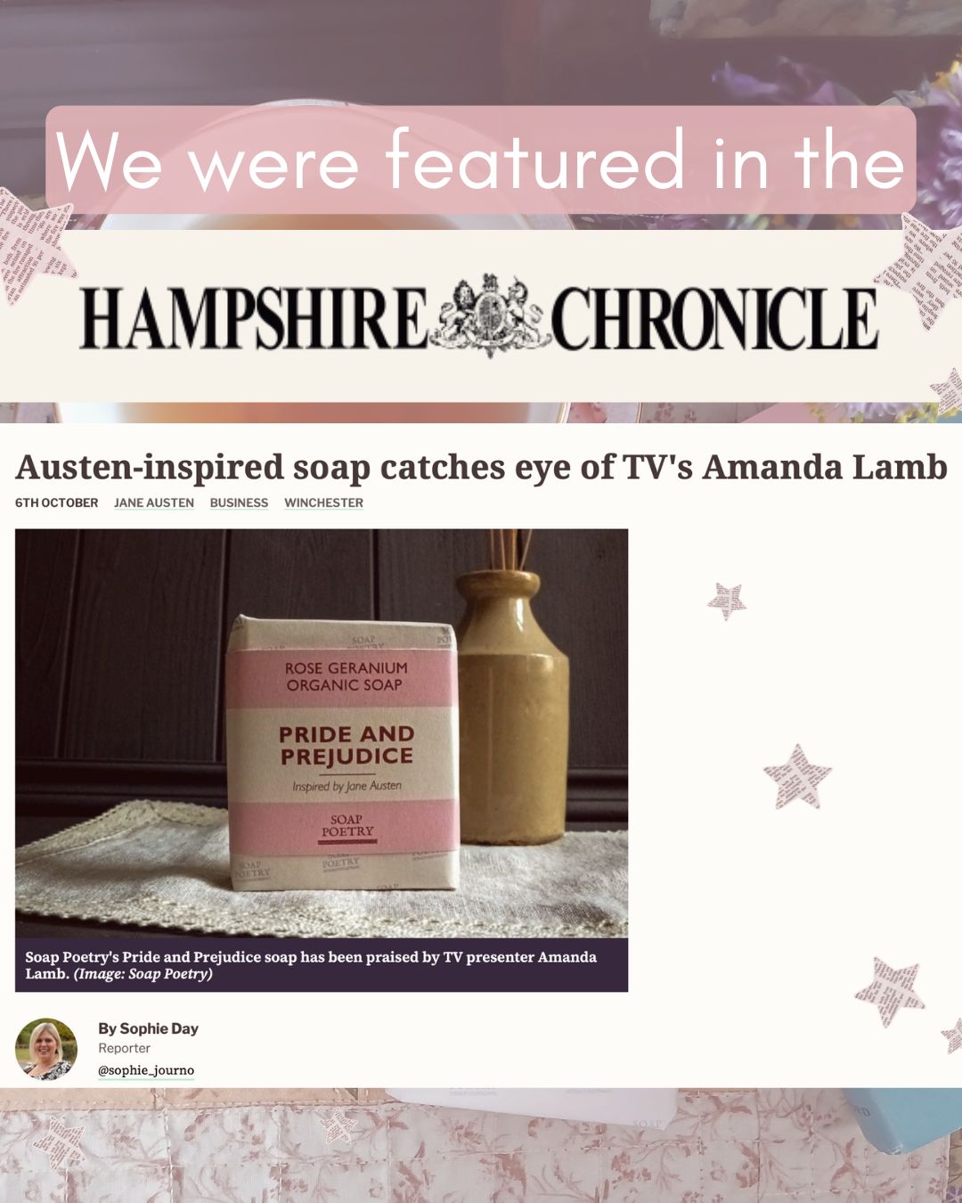 We were delighted to be featured in the Hampshire Chronicle —especially meaningful, as Hampshire was home to Jane Austenwhose works inspire two of our literary-themed soaps. And we’re ever grateful to the immeasurably kind Amanda Lamb.
