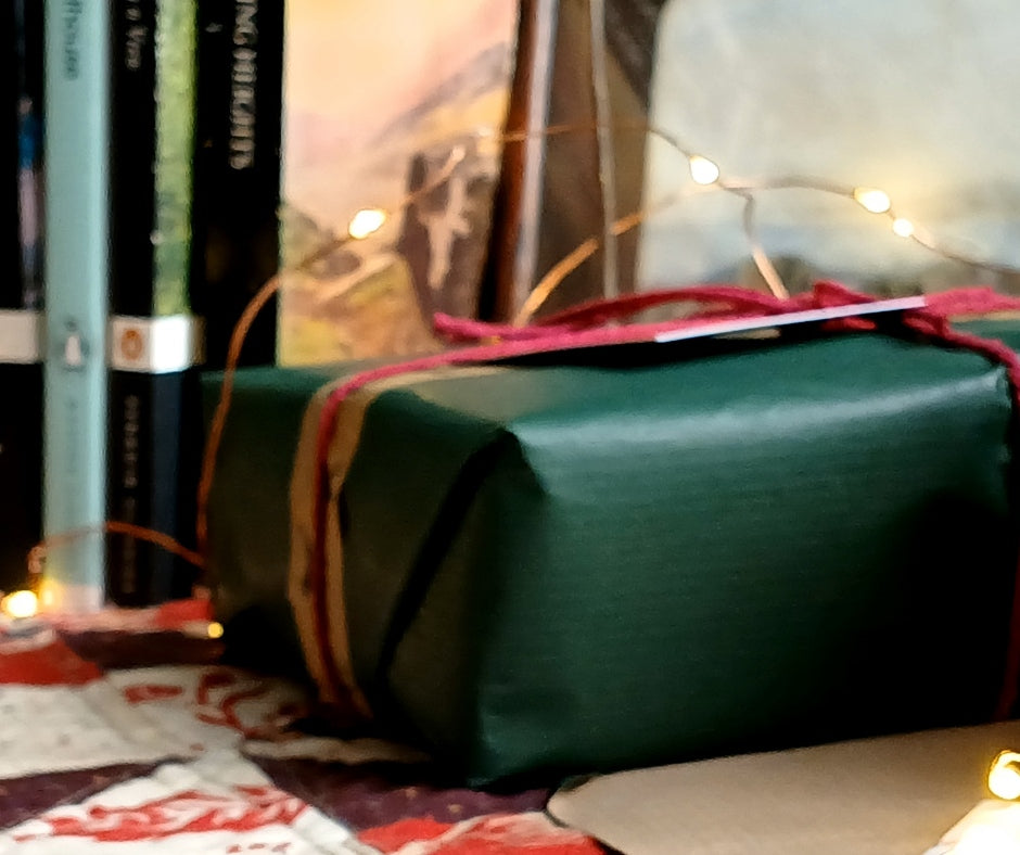 A Treasury of Soaps — lovingly made and beautifully presented. The soaps are wrapped together in dark green recycled Kraft paper and tied with cotton string, creating a bundle reminiscent of a visit to a bookshop of yesteryear. A keepsake bookmark and a Pride And Prejudice postcard are tucked inside — a thoughtful gift for book lovers and romantic souls.