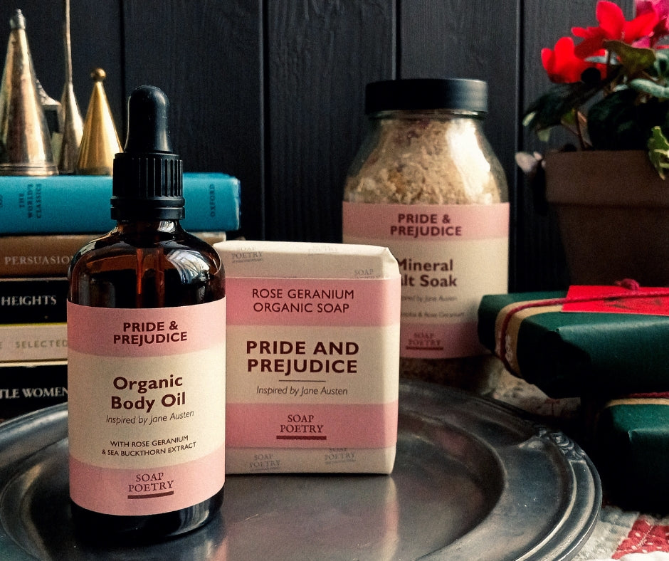 Experience a touch of Regency romance with our Pride and Prejudice-inspired gift set, featuring bath and body care scented with our signature rose geranium, grounded in warm, woody notes.